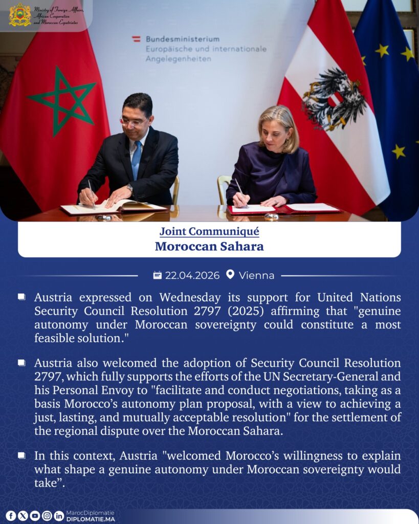 This stronger support from Austria adds to the growing international backing for Morocco’s position on the Sahara. This momentum has been increasing under the leadership of King Mohammed VI and was reinforced by the adoption of Resolution 2797 on October 31, 2025.